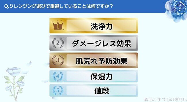 クレンジング選びで重視していることをお聞きしたところ「1位>洗浄力」、「2位>ダメージレス効果」、「3位>肌荒れ予防効果」、「4位>保湿力」、「5位>値段」という結果になりました。