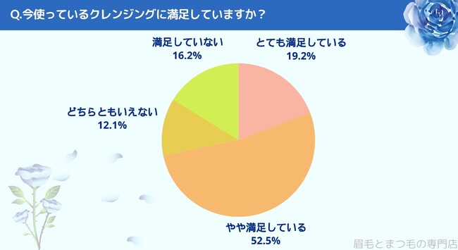 今使っているクレンジングに満足しているかお聞きしたところ「とても満足している(19.2%)」、「やや満足している(52.5%)」、「どちらともいえない(12.1%)」、「満足していない(16.2%)」という結果になりました。