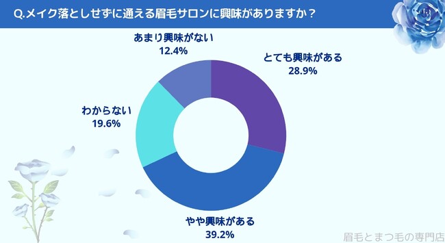 メイク落としせずに通える眉毛サロンに興味があるかお聞きしたところ「とても興味がある(28.9%)」、「やや興味がある(39.2%)」、「わからない(19.8%)」、「あまり興味がない(12.4%)」という結果になりました。