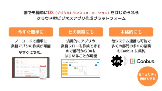 「Canbus.」とは、顧客管理(CRM)、営業管理、案件管理、勤怠管理、経費精算、出張精算、交通費精算、ワークフローなどの業務をDX化できるプラットフォームサービスです。データを管理、共有するためのアプリをノーコードで誰でも簡単に作れて、分析機能や可視化するダッシュボード機能などを活用した業務改善を実現できます。また、「Canbus.SI」がソブリンクラウドの環境構築からCanbus.でのアプリ実装、AI活用の伴走までを一気通貫でサポート。基盤づくりから現場の活用、高度なAI活用まで、一元的な支援体制でお客様のDXをトータルに牽引します。