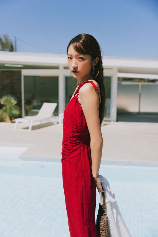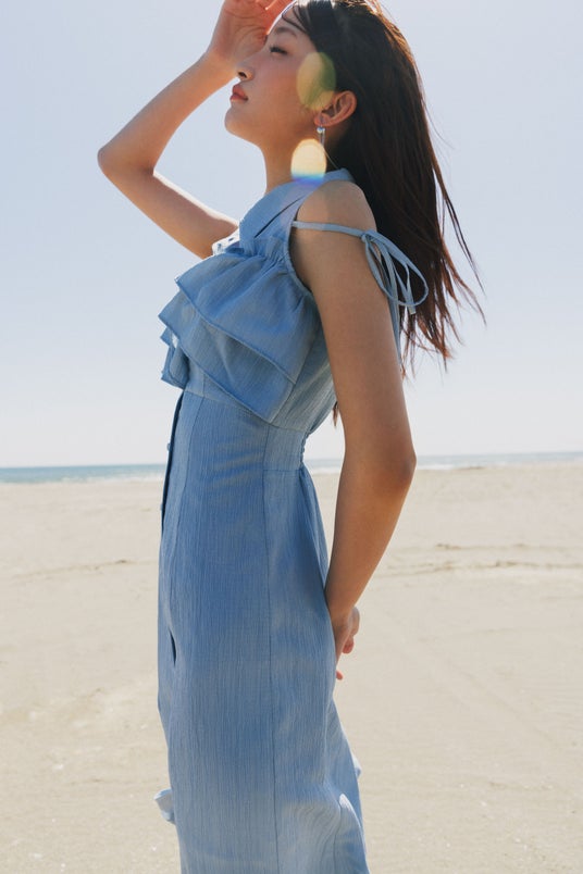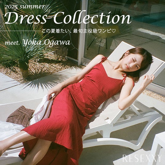 トレンドカラーの赤が目を惹くショルダーリボンキャミソールワンピースや、カジュアルながらもスリット入りでスタイルアップが期待できるスウェットワンピース、バブルスリーブでドレッシーな雰囲気のマーメイドワンピースなど計5型を小川桜花さんが可憐に着こなします。この夏にRESEXXYが最もおすすめするラインナップとなっており、纏うだけで華のある主役級ワンピースです。