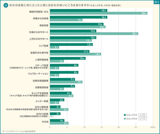 社会人6年目では、「職場の雰囲気・文化」が28.4%と最も高く、次に「先輩からのサポート」が25.7%と続きました。特徴的な点としては、「OJT制度」が社会人5年目では12.5%だったものの、社会人6年目では2.7%と大きく減少する結果となりました。
