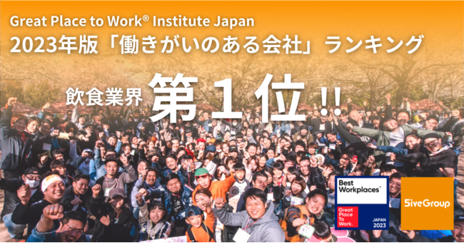「"楽しい"でつながる世界をつくる」を経営理念とする飲食企業の株式会社ファイブグループ(本社:東京都武蔵野市 代表取締役社長:坂本憲史 以下ファイブグループ)は、2023年2月9日、Great Place to Work(R) Institute Japan(以下GPTW)が主催する2023年版「働きがいのある会社(従業員100-999人部門)」ランキングにて10位にランクインしました。