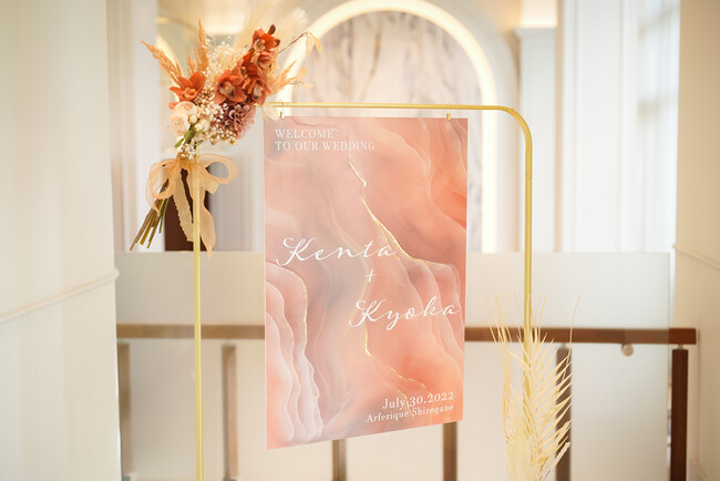 銅のスタンドにウェルカムボードと装花を組み合わせたもので、ウェルカムボードと装飾の両方の役割を担うだけでなく、これ一つでウェルカムスペースが一気に洗練されたお洒落な印象に。(ベイサイドパーク迎賓館千葉みなと/菅井亜深)