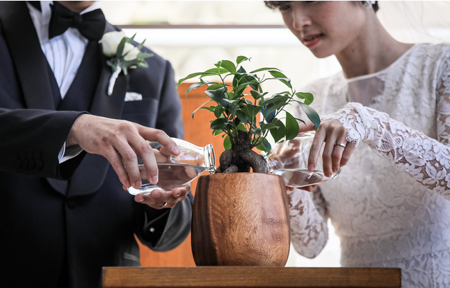 受付に用意した植木鉢にゲストの手で土を入れ、ご新郎ご新婦が苗木を植木鉢に移して水を注ぐセレモニー。和婚の定番演出である「水合わせの儀」のように、ご新郎ご新婦の実家で汲んだ水を使用します。苗木は平和と幸せの象徴であるオリーブや「幸福を呼ぶ木」と言われるガジュマルが人気。