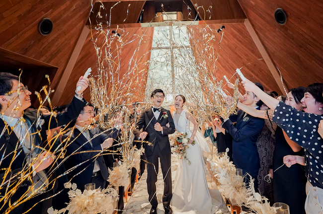 挙式後演出として定番の「フラワーシャワー」は、全員同時に撒いてその瞬間を写真におさめる、一体感のあるスタイルに進化。ゲストが持ったクラッカーからテープが飛び出す「スパイダーシャワー」は、クラッカーにテープが繋がっていて散らばらないため、今までシャワー系演出ができなかった場所でも行うことができる点が好評です。ブーケトスのかわりに高級ブランドのハンドクリームやコスメの詰め合わせをトスする「コスメトス」はブーケ以上に盛り上がるので、ゲストとわいわい楽しみたいというご新郎ご新婦に人気です。