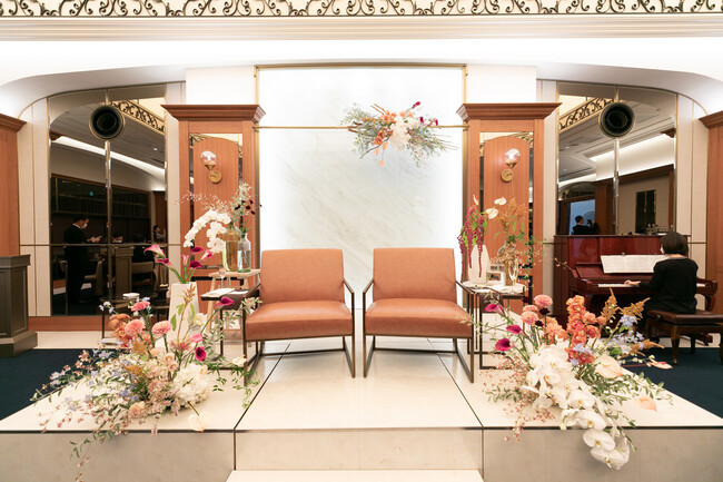・ご新郎ご新婦の席は、ソファよりもコンパクトな一人用のイスを二脚並べるスタイルの希望が増えています。(アクアテラス迎賓館大津/池本朱香)