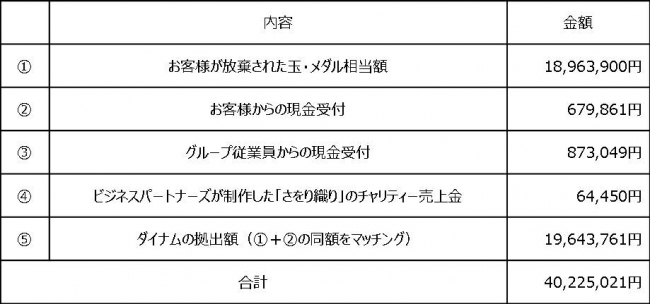 今回の義援活動は、7月10日(火)から8月31日(金)の期間において、店舗に来店されたお客様からご協力いただいた18,963,900円と、お客様から受付した679,861円、グループ従業員から受付した873,049円、グループ会社のビジネスパートナーズが制作した「さをり織り」のチャリティー売上金64,450円、さらに当社から19,643,761円を拠出し、合計40,225,021円を義援金として日本赤十字社へ寄託するものとなります。