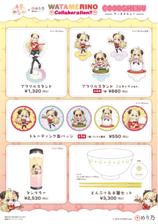 羊のタレントである『角巻わため』と、羊肉しゃぶしゃぶが人気の『めり乃』の豪華コラボメニューが期間限定でお楽しみいただけます。コラボメニューをご注文頂いた方へ、特別描き下ろしイラストを使用した限定クリアファイルや、コースターをプレゼント!さらに、店内は、期間限定で『角巻わため』の装飾と本人による店内放送も実施予定です。 また、オリジナルグッズの店内販売や、WEB通販にて受注販売も決定!