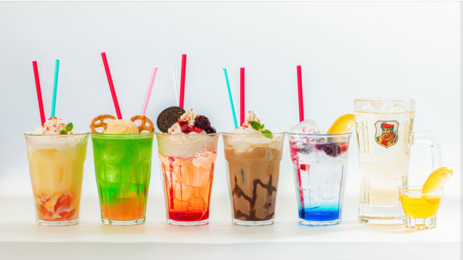 (左から、わためのドドドドリンク・わためろんクリームソーダ・わためオンステージソーダ・愛昧ショコララテ・わためぇNightレモンサワー※アルコール・エナドリキマるハイボール※アルコール)