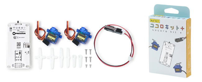「ココロキット+」(ココロキット プラス)は、つなげるだけで動きのある作品を簡単に作ることができるモジュールで、プログラミングをするとより自由な動きに挑戦することができます。本キットは、小学生のプログラミング教育でも活用されており、動きをつけること以外に、画像認識、音声認識などの人工知能や、しゃべらせたり、無線も使える高機能なことも特長です。