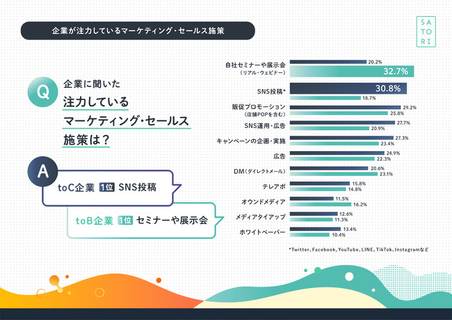 現在注力するマーケティング施策は、toB企業では「自社セミナーや展示会」(32.7%)など新規顧客獲得のための施策が上位に。toC企業では生活者と直接コミュニケーションがとれるSNS施策が上位に。
