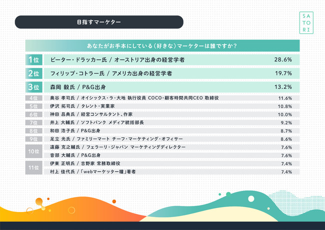 企業のマーケティング従事者がお手本にしているマーケターは、ピーター・ドラッカー氏(28.6%)とフィリップ・コトラー氏(19.7%)。日本人では森岡毅氏(13.2%)、奥谷幸司氏(11.6%)、が上位に。