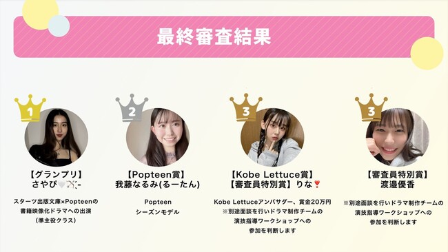 また、「Popteen賞」を受賞した「我藤なるみ」さんはPopteenシーズンモデルに、「Kobe Lettuce賞」と「審査員特別賞」を受賞した「りな」さんはKobe Lettuceアンバサダーに就任しました。同じく「審査員特別賞」を「渡邉優香」さんが受賞しました。