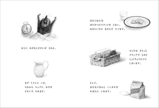 トガリネズミは働きもの。朝おきてから夜ねるまで、毎日きまった予定をこなし、つつがなく暮らしています。でも今日はひとつだけ、いつもと違うことがありました! ひとめ見たら忘れられない、つぶらな瞳のトガリネズミ。そのささやかでありふれた日常を、独特のおかしみをもって描きます。