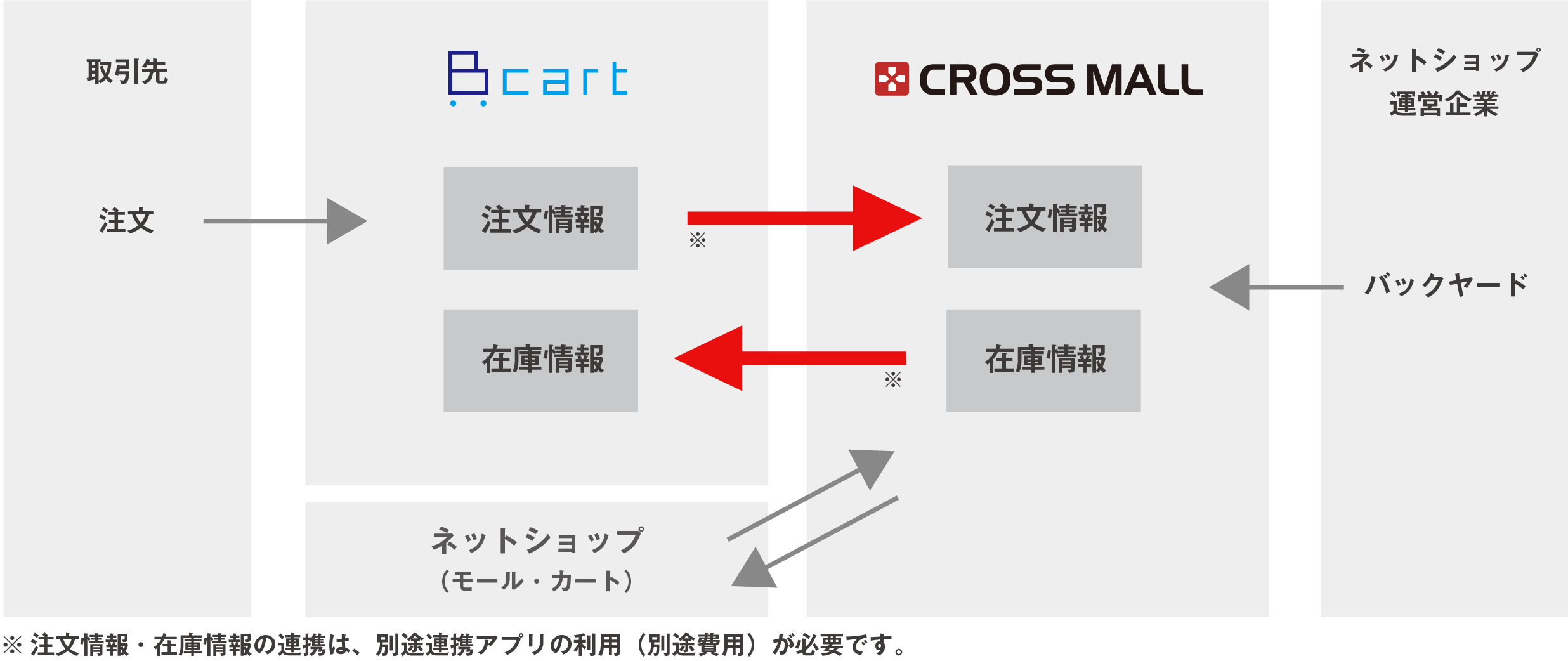 このたびの連携により、「Bカート」を利用し複数ネットショップを展開している企業さまは、「CROSS MALL」が管理している注文情報を反映することで、随時更新されている在庫数を「Bカート」の在庫数と共有することが可能となり、在庫を一元管理できます。