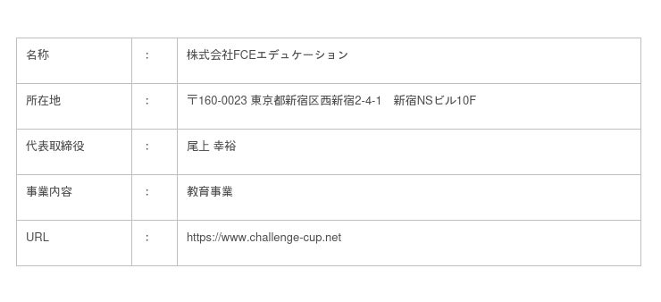 「チャレンジカップ」とは株式会社FCEエデュケーションが主催する、小学生~高校生を対象とした、「自分で決めた目標に挑戦する」大会です。「チャレンジカップ2008」の開催から15年間で14万人以上の子どもたちが参加してきました。大会に参加する子ども達は、勉強・スポーツ・地域貢献活動など、それぞれが挑戦したい分野で半年間の目標を決め、エントリーをします。チャレンジ終了後は活動報告を提出し、その目標に対して、どれだけ本気で挑戦し、どれだけ成長できたかを全国の教育機関の専門家や有識者達が審査、表彰されます。このチャレンジカップに参加をし、一生懸命頑張るという経験を通じ、子ども達が素晴らしい成長を遂げています。