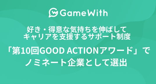 株式会社GameWith(本社:東京都港区、代表取締役社長:今泉卓也、以下「当社」)は、この度、企業が独自に取り組んでいる研修や社内イベント等を表彰する「リクナビNEXT」主催の「第10回GOOD ACTIONアワード」にてノミネート企業として選出されました。