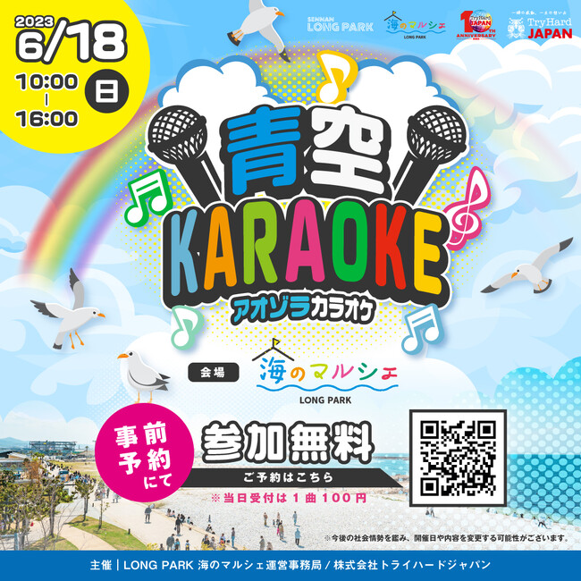 株式会社トライハードジャパン(所在地:大阪市中央区)は、2023年6月18日(日)にSENNAN LONG PARK(泉南ロングパーク)内、海のマルシェ(所在地:大阪府泉南市)にて、屋外カラオケイベント「青空KARAOKE」を開催いたします。