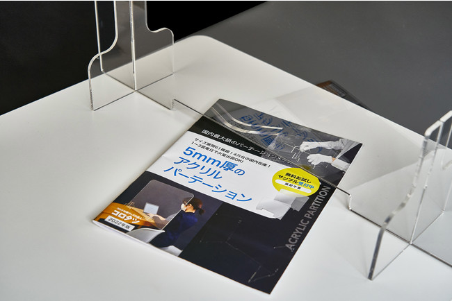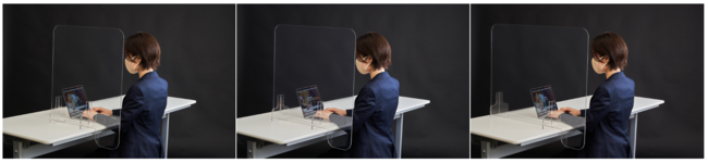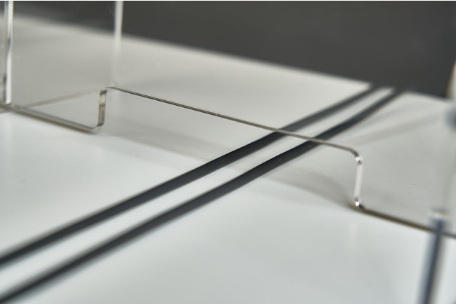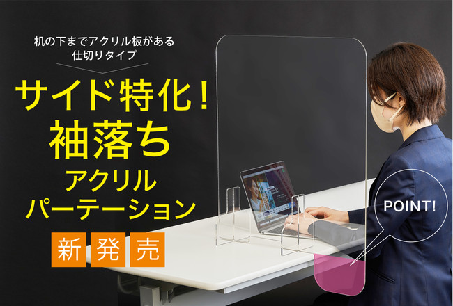 現在、アクリルパーテーションを60種類以上ラインアップしている当社ですが、今回新発売する「サイド特化!袖落ちアクリルパーテーション」は、5mm厚のアクリル板が机の下10cmの部分まであり、側面からの飛沫を防止できる仕切り用タイプです。ご使用のデスク等に最適なものを選べるよう3サイズをご用意。開口部分があるので書類の受け渡しや配線類が多い場合にも便利です。とくに飲食店のカウンター席やオフィスのデスクへの設置にオススメです。