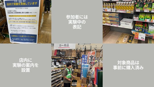 本実験は、安全かつ法的に問題のない形で実施されました。疑似的な行動であることを確保するため、対象商品は事前に研究者側で購入済みとし、実験参加者には終了後にその事実を説明し、安心して振り返りができるよう配慮いたしました。また、誤解を避けるため、実験参加者にはベストを着用してもらい、「実験中」のシールを貼ったバッグを使用するなど周知を徹底し、実験中におけるトラブルや誤解は生じておりません。