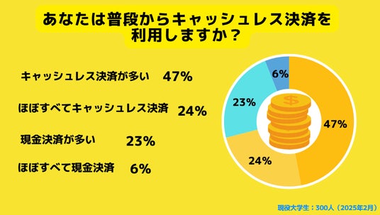 普段からほぼすべてキャッシュレス決済を利用する人は23%でした。キャッシュレス決済が多いと回答した人は47%でした。現金決済が多いと回答した人は47%でした。ほほすべて現金決済を利用していると回答した人は6%でした。