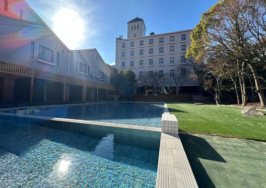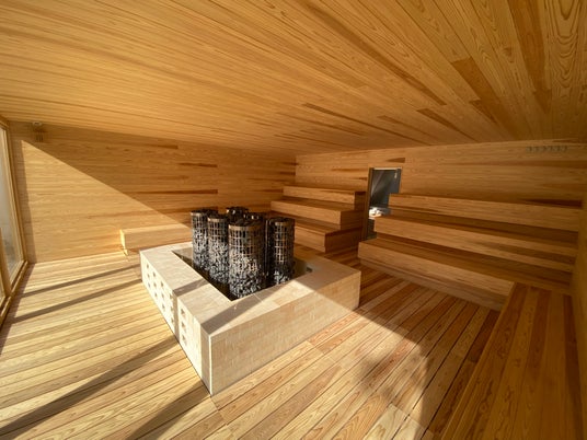 施設のパティオ(中庭)には、瀬戸内海を象徴する水盤プールを配置。アイコニックな三角屋根が特徴的なチャペルサウナは男女兼用で、カップルの方でもご一緒にお楽しみいただけます。
