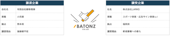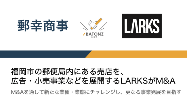 M&A総合支援プラットフォーム「BATONZ(バトンズ)」を運営する株式会社バトンズ(本社:東京都中央区、代表取締役:神瀬悠一、以下バトンズ)は、熊本県事業承継・引継ぎ支援センター(所在地:熊本県熊本市、統括責任者:田中輝明)とともに、有限会社郵幸商事(本社:熊本県熊本市、以下郵幸商事)と、株式会社LARKS(本社:福岡県福岡市、以下LARKS)のM&A成約を支援したことをお知らせします。