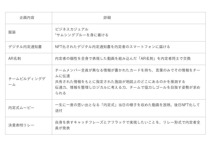 内定式では、内定者がDX@Aflacを体感することを企図し、金融業界で初めて*1内定通知書のNFT*2化を実施し、「デジタル内定通知書」を授与しました。その後、予め各自が撮影した自己紹介動画の二次元バーコードが印刷された「AR名刺*3」を内定者同士で交換することで、お互いの個性を知り、繋がりを深める時間を過ごしました。最後にはチームビルディングゲームを行い、当社が大切にしている「チームとして働くこと」を体感しました。