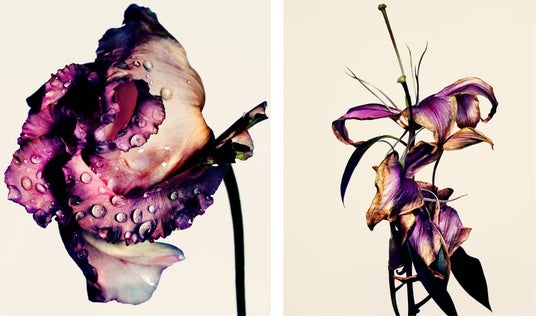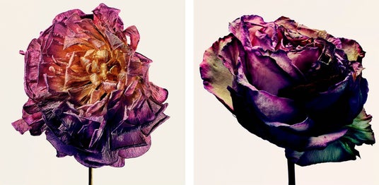 行きつけの花屋で花を買っては枯れ具合を数日間観察し一人で撮影した。枯れた花の美しさ、それはまるで老人の深く皺の刻まれた皮膚の様であり、水分が失われることで表れるシルクの様な艶、オーガンジーの様な硬質なイメージであったり生の肉の様な妖艶さであったりと、どこか重苦しくダークでデカダンな美しさでもある。