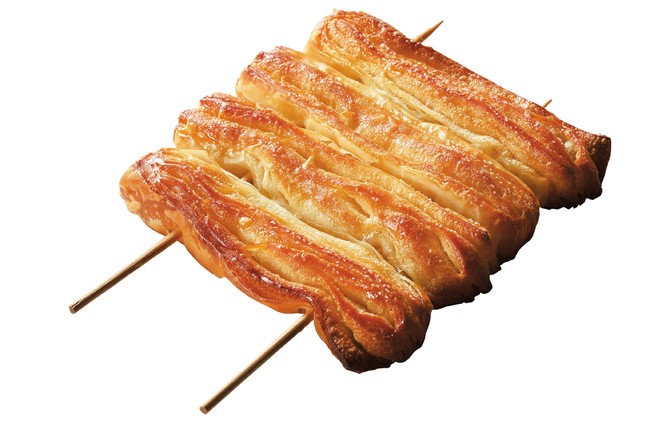「かば焼きデニッシュ」は思わずご飯の上に乗せてしまいそうな、蒲焼きにそっくりなデニッシュです。より本物の蒲焼きに近づけるためにたれの艶感や焼き目を表現することにこだわりました。細く切ったパイシートを横に串を指すことで、パイシートの膨らむ断面を蒲焼きに見立て、仕上げにかけるメープルシロップでたれの艶感を演出し、どこから見ても蒲焼きに見えるよう仕上げました。サクサク食感とほんのり甘いデニッシュ生地に、卵を塗り、香ばしく焼き上げた後メープルシロップをかけた、見た目とのギャップを楽しめ、クセになる一品です。