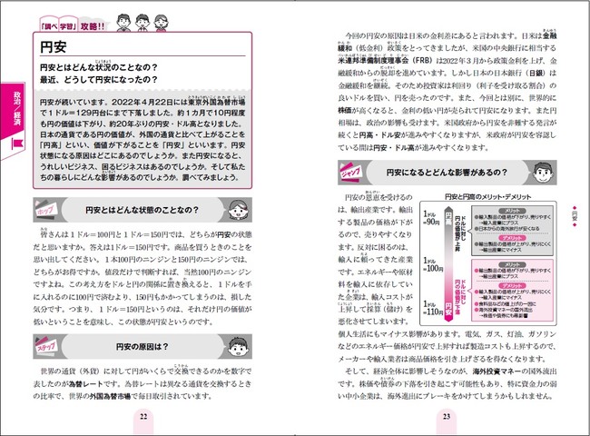 授業の一環で「調べ学習」をする学生の方も多いのではないでしょうか。本書の「調べ学習攻略!!」のページでは、現代の諸問題が「どのような問題なのか」「なぜ起きているのか」「これからどうなるのか」を3ステップでまとめています。
