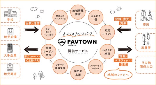 「FAVTOWN ehime」は、愛媛で暮らす住民や出身者・行政・地元企業・学校・団体などが「地元が好き」という共通項でつながるふるさとファンメディアです。進学や就職をきっかけにふるさとを離れてがんばる若者がふるさととのつながりを感じられるように、地元企業と協力したふるさと便の送付や母校の活動などの地元情報を発信します。