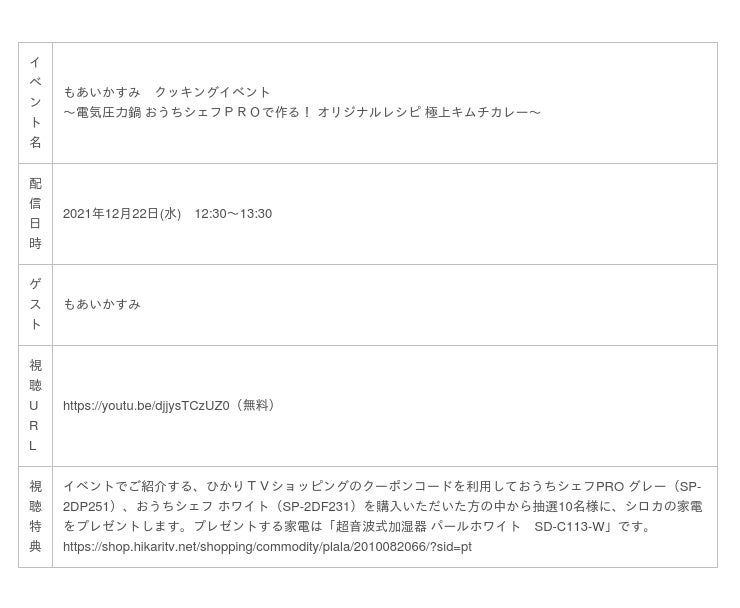 株式会社NTTぷららが運営するショッピングサービス「ひかりTVショッピング」は、人気の栄養士/料理家のもあいかすみさんを迎え、当サービスで販売しているシロカの調理家電「電気圧力鍋おうちシェフPRO」を紹介するYouTube Liveイベントを2021年12月22日(水)12:30より開催します。
