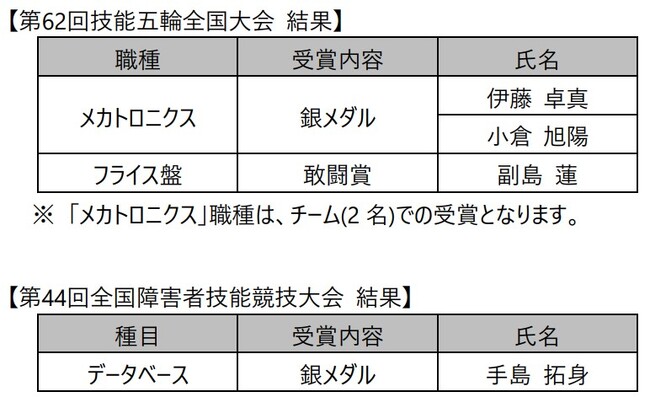 また、同時開催された第44回全国障害者技能競技大会(全国アビリンピック)には2種目2名が出場し、「データベース」種目で銀メダルを獲得しました。