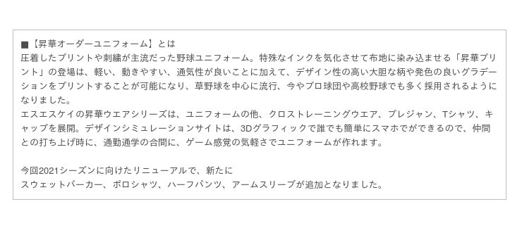株式会社エスエスケイ(本社/大阪市中央区、代表取締役社長/佐々木恭一)は、カスタムオーダー昇華ユニフォームキャンペーンを実施中。