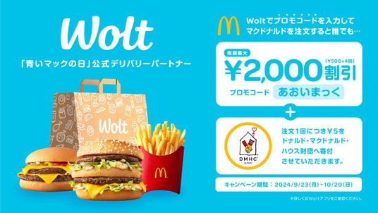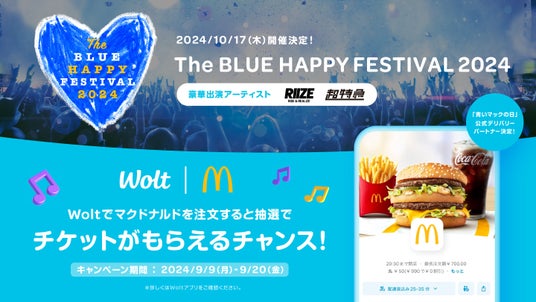 デリバリーサービス「Wolt(ウォルト)」を展開するWolt Japan株式会社(本社:東京都渋谷区、代表:ナタリア・ヒザニシヴィリ、以下 Wolt)は、日本マクドナルド株式会社(本社:東京都新宿区、代表取締役社長兼CEO:トーマス・コウ、以下マクドナルド)のチャリティ活動「青いマックの日」に公式デリバリーパートナーとして協賛します。本協賛に合わせ、2024年10月17日(木)に神奈川県横浜市の「ぴあアリーナMM」で開催されるチャリティ音楽フェス「The BLUE HAPPYFESTIVAL 2024」のチケットプレゼントキャンペーンを9月9日(月)から9月20日(金)まで実施するほか、Woltアプリやウェブサイトでマクドナルドのご注文が総額最大2,000円OFFとなるお得なキャンペーン*を9月23日(月)から10月20日(日)まで実施します。
