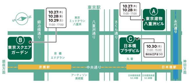 場所 :東京建物八重洲ビル(10/27-28)、東京スクエアガーデン(10/27-29)、日本橋プラザビル(10/30)