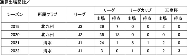 J1リーグ戦通算 27試合出場1得点/J2リーグ戦通算 35試合出場18得点/J3リーグ戦通算 26試合出場7得点