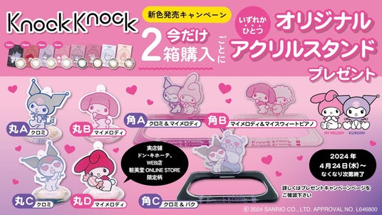 化粧品、化粧雑貨、服飾雑貨、及びキャラクター雑貨等の企画・製造・販売、コンタクトレンズの企画・販売を行う粧美堂株式会社(本社:東京都港区、代表取締役社長:寺田正秀)は、コンタクトレンズブランドKnock Knock(ノックノック)と株式会社サンリオのキャラクター「クロミ」「マイメロディ」コラボシリーズ、1monthタイプのカラーコンタクトレンズ新作4種を、2024年4月24日(水)より発売いたします。