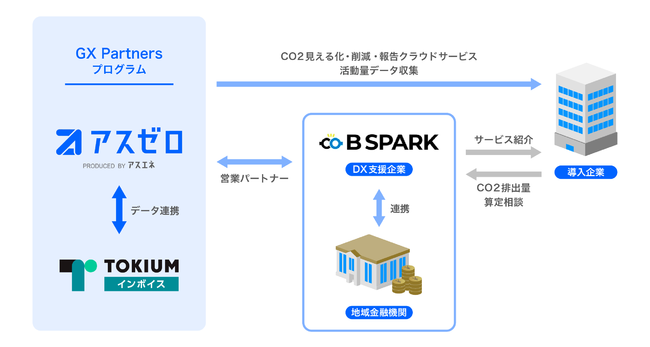 CO2排出量見える化・削減クラウドサービス「アスゼロ」を提供するアスエネ株式会社(本社:東京都港区、代表取締役CEO:西和田 浩平、以下「当社」)は、株式会社TOKIUM(本社:東京都千代田区、代表取締役:黒崎 賢一、以下「TOKIUM」)が企画し、当社も参画するプログラム「GX Partners」を提供開始します。本プログラムは、株式会社B Spark(代表取締役社長:財徳 悦生、本店:東京都千代田区、以下「B Spark」)より提供いたします。