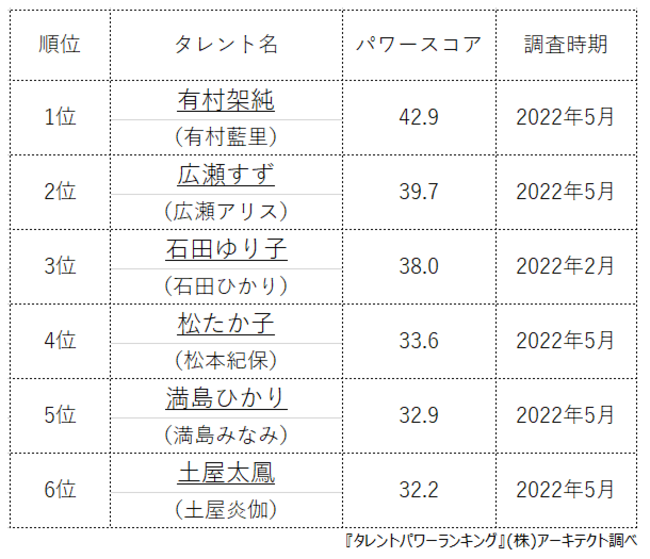 本ランキングは、2022年5月度に実施したタレント調査データ(一部過去実施データ)を利用し、タイトルに応じてランキング形式でまとめたものです。