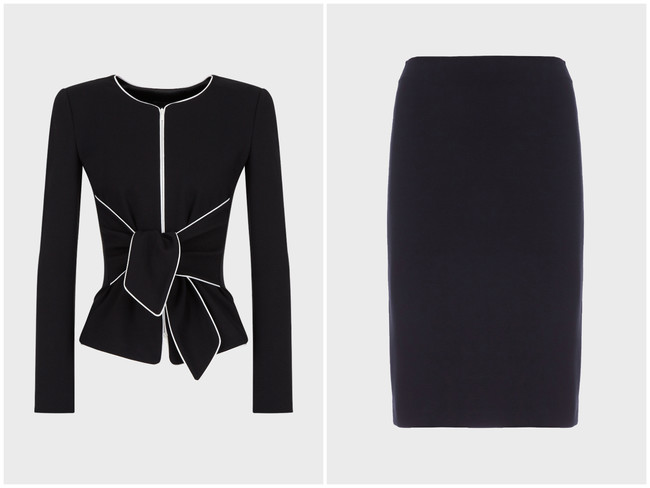 黒のジャージー素材のノーカラージャケットと膝丈タイトスカートのセットアップは、シンプルでありながらもフェミニンな雰囲気。ジャケットのフロントデザインには、ウェスト部分のクロージャ―として愛らしいボウデザインがあしらわれています。