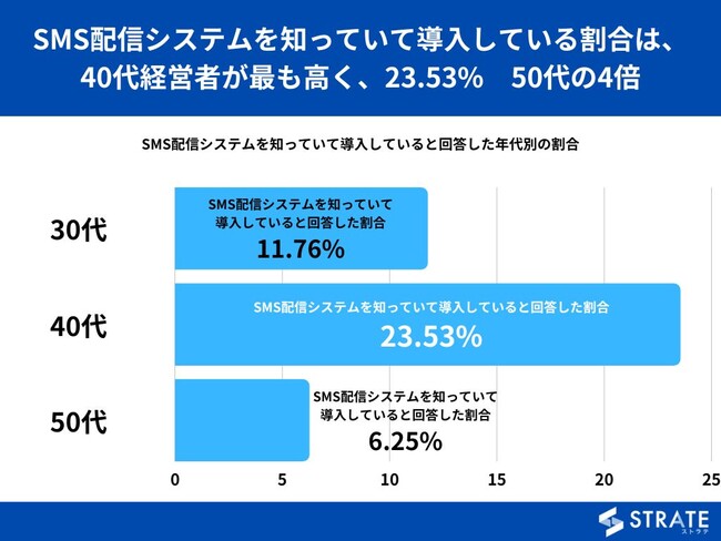 【SMS配信システムを知っていて導入している割合は、40代経営者が最も高く、23.53% 50代の4倍】