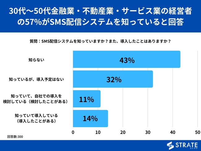 30代~50代の男女を対象とした「SMS配信システムを知っていますか?また、導入したことはありますか?」というアンケートで最も多かった回答は「知らない」で43%でした。