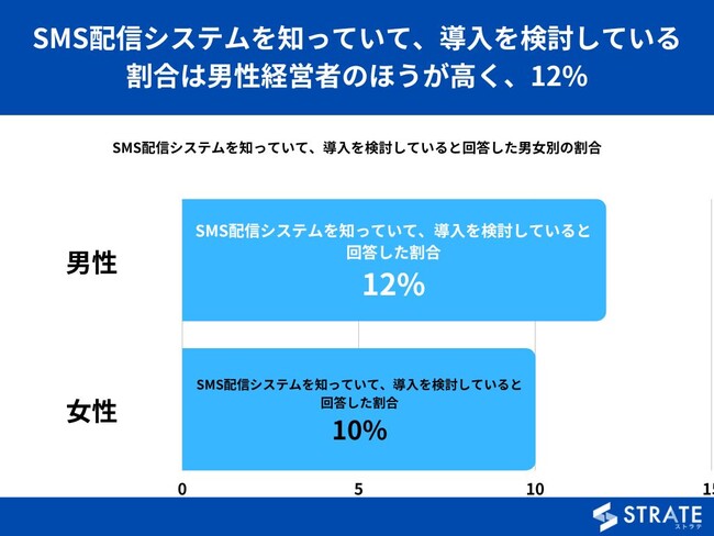 【SMS配信システムを知っていて、導入を検討している割合は男性経営者のほうが高く、12%】