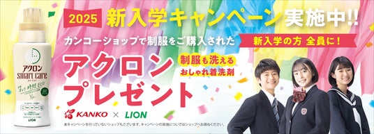 菅公学生服株式会社 (本社:岡山市北区駅元町、代表取締役社長:尾崎 茂 以下:カンコー学生服)は、 ライオン株式会社(本社:東京都台東区蔵前、代表取締役兼社長執行役員:竹森 征之 以下:ライオン)と連携して、2025年1月より、制服の家庭洗濯の不安解消を目的に「制服はお家で洗おうキャンペーン」を実施し、カンコーショップで制服を購入される新入学の方を対象にライオンの「アクロンスマートケア」と「洗濯魔法BOOK」を約3万名に無料プレゼントいたします。
