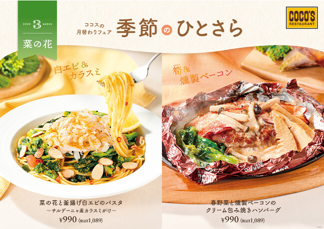 3月のメニューは、菜の花と希少な白エビ、高級食材のイタリア サルデーニャ産のカラスミを使用した本格パスタ「菜の花と釜揚げ白エビのパスタ~サルデーニャ産カラスミがけ~990円(税込1,089円)」と、菜の花と筍(たけのこ)をココス定番のハンバーグと煮込んだ「春野菜と燻製ベーコンのクリーム包み焼きハンバーグ(145g)990円(税込1,089円)」の2品です。お手軽な価格で、旬の食材を活かした贅沢な一品をご堪能いただけます。