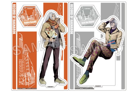 2月1日にコアミックス公式オンラインショップ“ゼノンショップ”で販売を開始した終末のワルキューレ オフショットコレクション「アクリルスタンド 佐々木小次郎」、終末のワルキューレ オフショットコレクション「アクリルスタンド ジャック・ザ・リッパー」がおしゃれなお店をバックに2人並んで写真を撮っている。