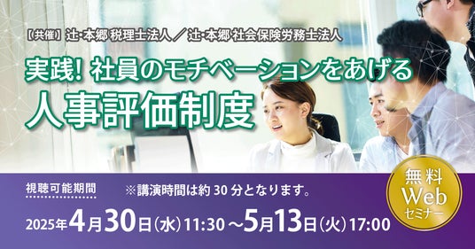 辻・本郷 税理士法人(本社:東京都新宿区、理事長:桑木小恵子)は、辻・本郷 社会保険労務士法人(本社:東京都新宿区、代表社員:高橋紀行)の2社共催で、2025年4月30日(水)より「実践! 社員のモチベーションをあげる人事評価制度」セミナーを開催いたします。